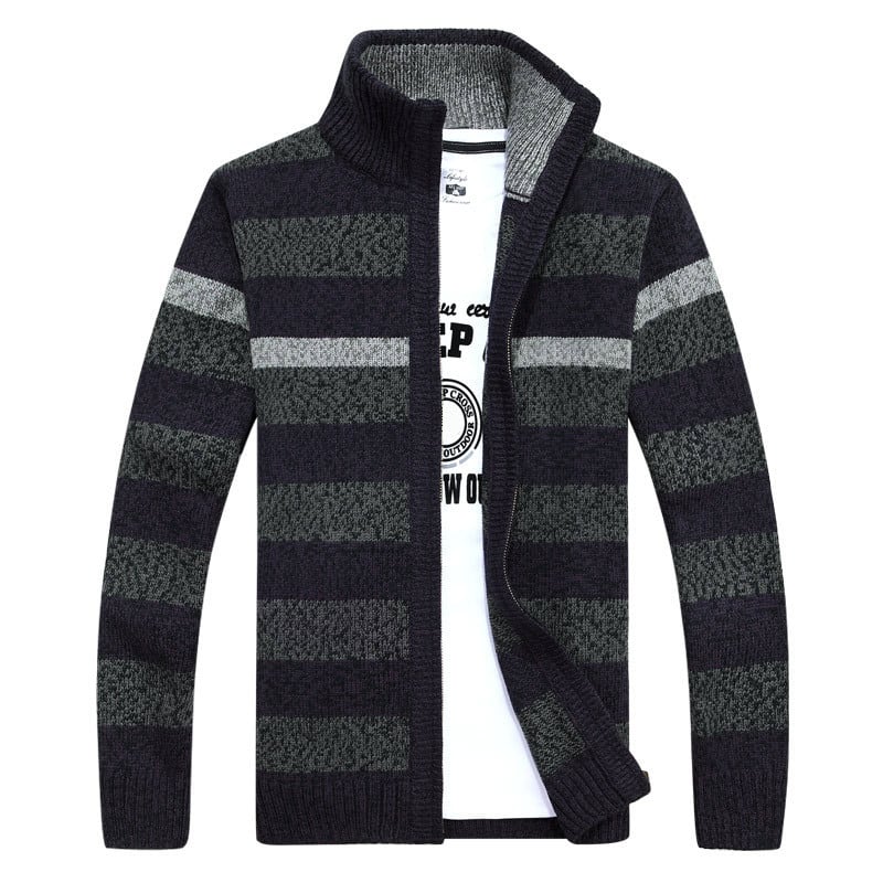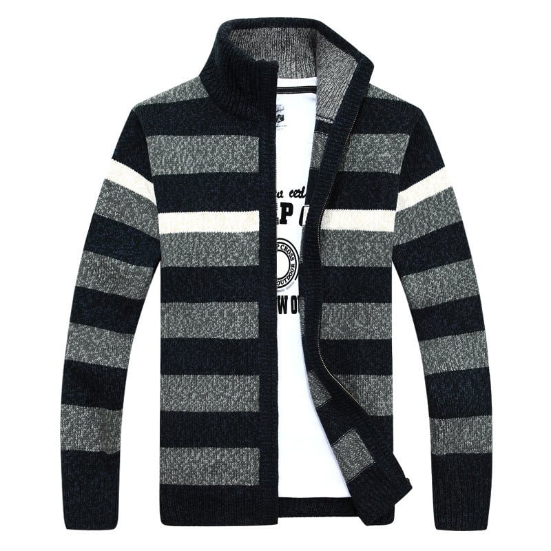カジュアルな立襟のカーディガンのニットのストライプ【韓流メンズスタイル】
