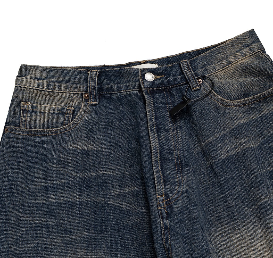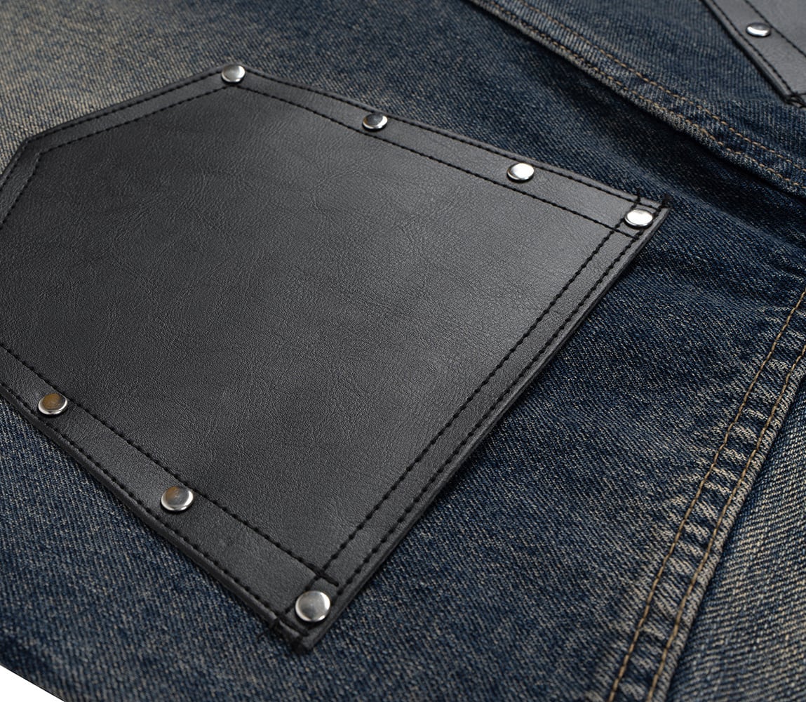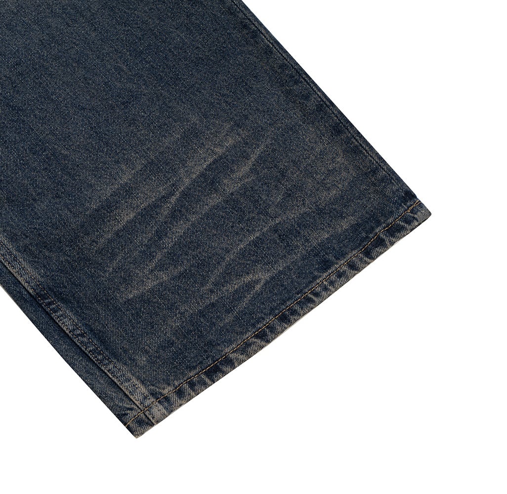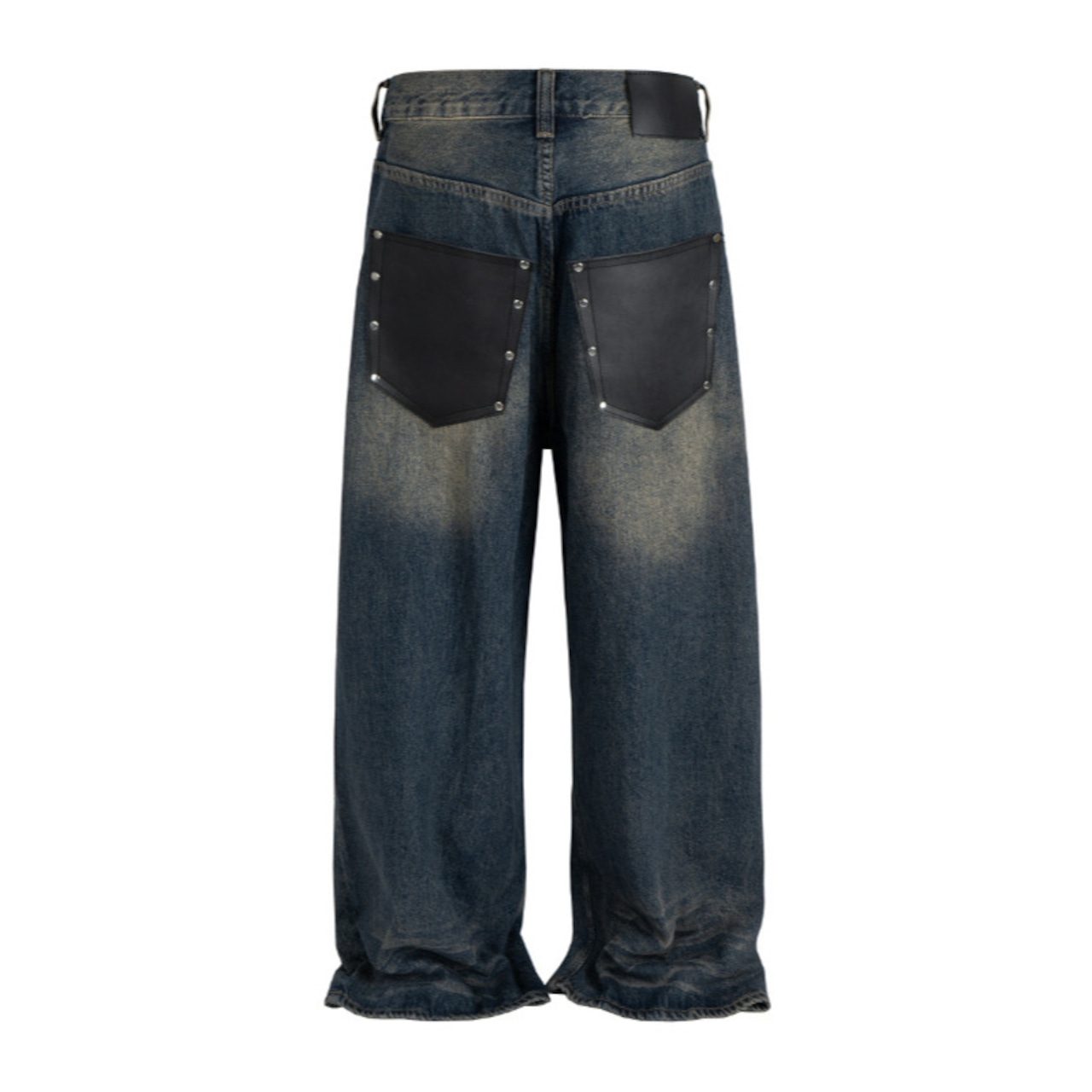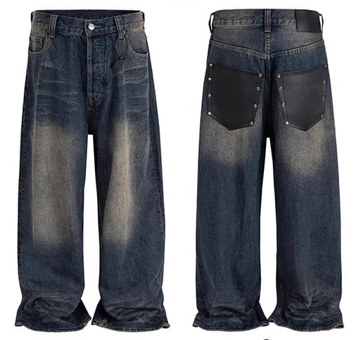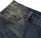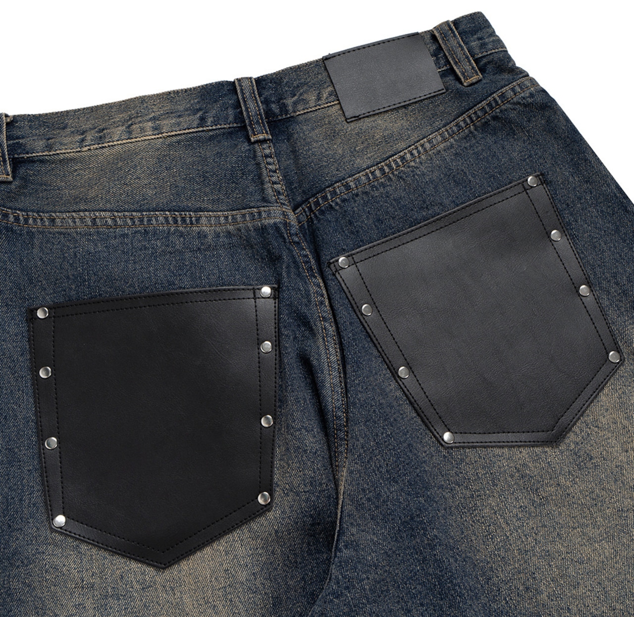 レザーポケット ダメージウォッシュダークブルーダーティパンツ【韓流メンズファッション】