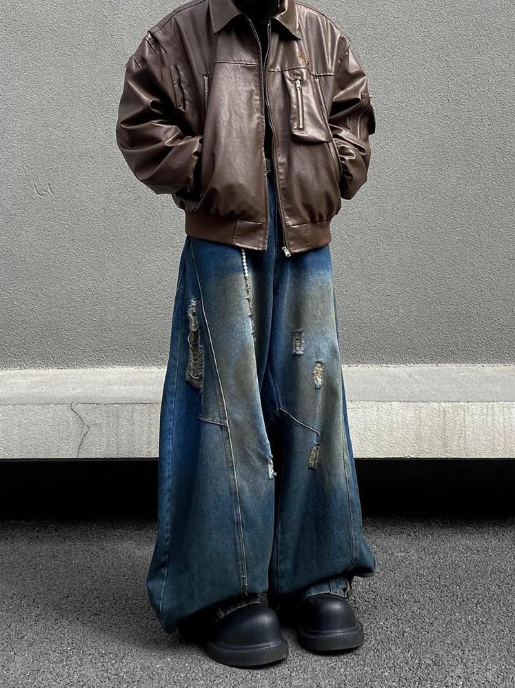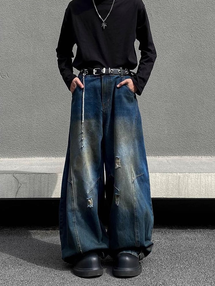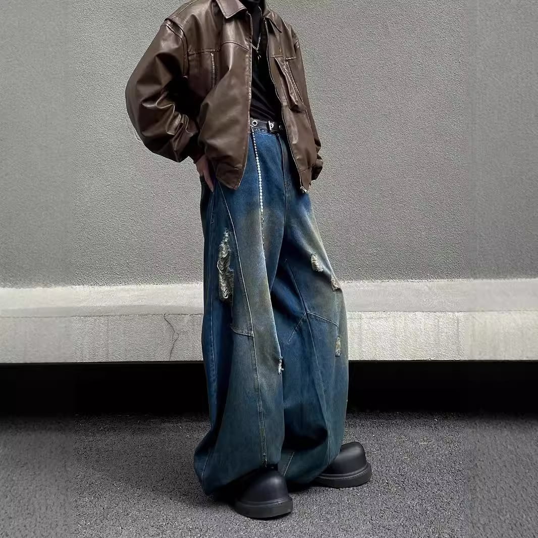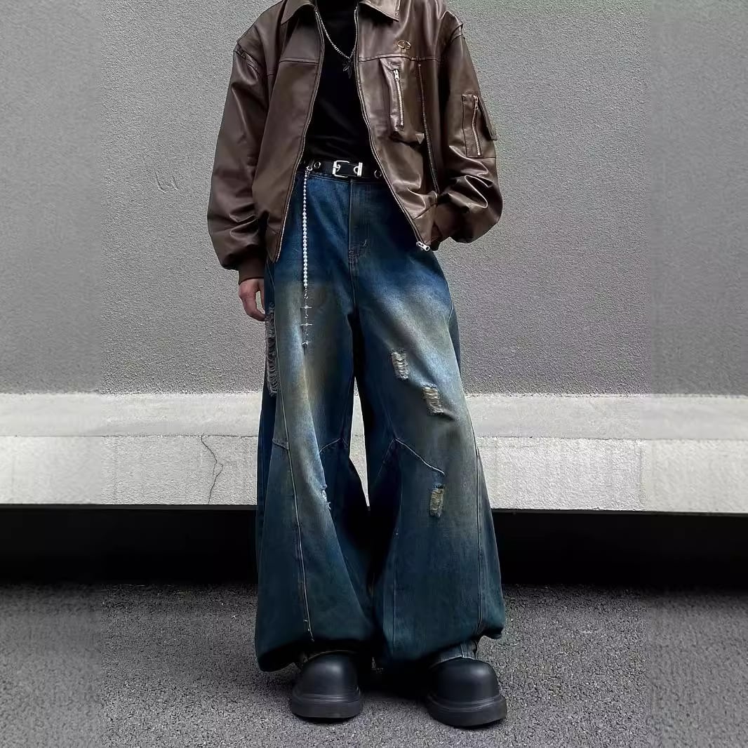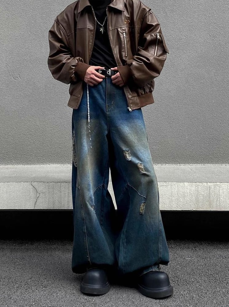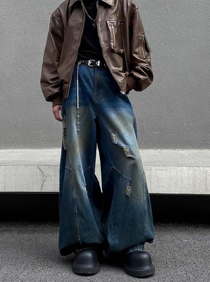 レトロダメージ加工・ストレートルーズワイドパンツ【韓流メンズファッション】